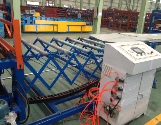 主要由瓦楞板壓型機和彩鋼復合機組成,可以一次性制做墻面彩鋼夾芯板或屋面彩鋼夾芯板,并且瓦楞板壓型機和復合機可以獨立生產。整條流水線壓型部分由彩鋼板開卷機、冷彎成型主機、切斷裝置組成,復合機部分由彩鋼板開卷,EPS板或巖棉板輸送,墻面淺波峰壓制,混合涂膠、加溫加壓、復合、平板卷邊、企口板翻邊、開槽、整邊、氣動夾緊、自動覆膜、自動切割、成品拖架組成;