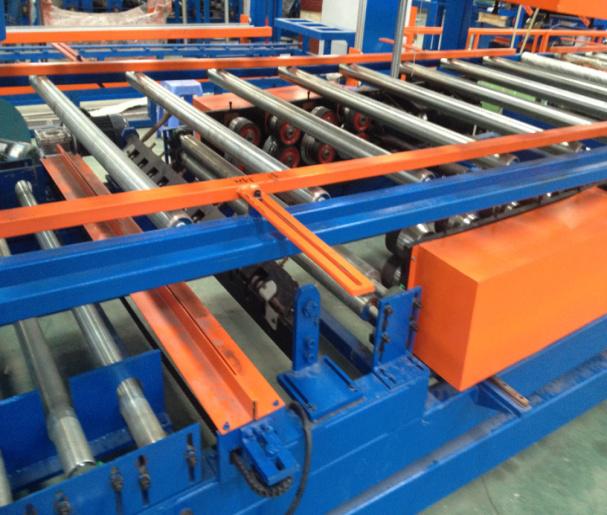 主要由瓦楞板壓型機和彩鋼復合機組成,可以一次性制做墻面彩鋼夾芯板或屋面彩鋼夾芯板,并且瓦楞板壓型機和復合機可以獨立生產。整條流水線壓型部分由彩鋼板開卷機、冷彎成型主機、切斷裝置組成,復合機部分由彩鋼板開卷,EPS板或巖棉板輸送,墻面淺波峰壓制,混合涂膠、加溫加壓、復合、平板卷邊、企口板翻邊、開槽、整邊、氣動夾緊、自動覆膜、自動切割、成品拖架組成;